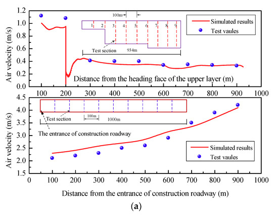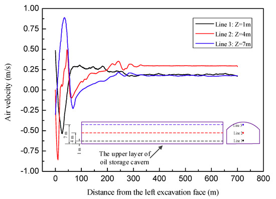 The cross-section area increases from 135 m2 to 363 m2 after entering the middle layer excavation, causing a sharp drop in the air velocity. The value near the middle bench is approximate 0 m/s due to the height of the middle bench, and then it tends to be stable after about 50 m. The air velocity in the middle bench of the two caverns is not very different, about 0.4 m/s. The cross-section area further enlarges to 436 m2 after entering the bottom layer excavation and the steady air velocity of the two caverns further decreases to 0.35 m/s. Since large-scale caverns generally adopt the method of layered excavation, the air velocity presents a more obvious step-like distribution. The current “Technical Specifications for Construction of Highway Tunnel” (JTG F60-2009) [37] and “Safety Regulations for Coal Mines” [38] stipulate that the minimum air velocity in the cavern must reach 0.15 m/s. Thus, the axial-flow gallery ventilation scheme, by using shafts for the fresh air, can meet the air velocity requirements of the relevant regulations.