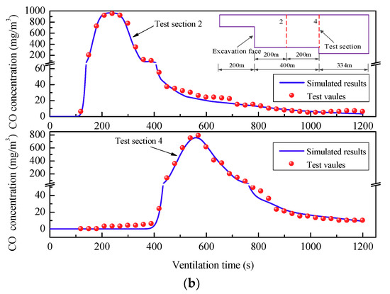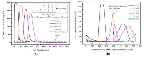 In order to inspect the variation in CO with ventilation time in the working area (about 300 m to 400 m away from the excavation face), four cross-sections with a spacing of 100 m in the middle bench were monitored in the numerical calculation, as shown in Figure 14a. The CO concentration in the working area was decreased below the safety standard value of 30 mg/m3 after 15 min of ventilation, which meets the requirements for safe and rapid construction. Figure 14b presents the CO concentration distribution at breathing height (1.6m from the ground) with ventilation time. It can be seen that the high concentration of CO in the cavern continues to migrate toward the connecting roadway with the increase of ventilation time, and the maximum CO concentration decreases gradually. The CO concentration of the whole cavern decreases below the safety standard value after 30 min of the axial-flow gallery ventilation scheme, which is much better than the effect of forced ventilation.