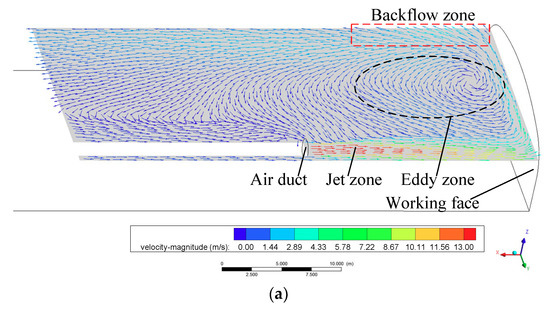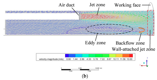 During forced ventilation in a cavern, the jet flow and backflow exist at the same time, which plays a role in the dilution and discharge of harmful gases generated during construction; hence, the airflow distribution near the heading face is more complicated. In order to show the characteristics of the jet flow and backflow more clearly and intuitively, the velocity vector at profile y = 18 m and horizontal section z = 5.5 m were analyzed. It can be seen from Figure 8 that there are several obvious zones in the duct jet flow field, namely, the wall-attached jet zone, impinging jet zone, eddy zone, backflow zone. In the process of airflow from the air duct, the surrounding air is continuously entrained by the jet flow, and the jet distance and range are increased. However, due to the limited space of a blind heading cavern and the continuity of airflow, the backflow is formed at the working face, and the zone is larger than the jet area. The backflow interacts with the jet flow to form the eddy zone in the middle zone. The eddy zone has adverse effects on the discharge of harmful gas near the heading face, and some harmful gas circulates in the eddy zone and needs to be diluted and discharged for a long time, which also can be observed in Wang et al.’s study [35].