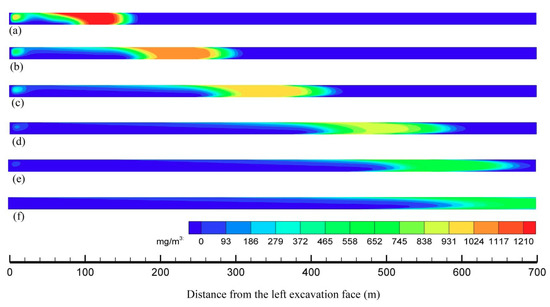 The distribution of CO mass concentration in the central axial plane within 30 min of ventilation after blasting is shown in Figure 10. It can be seen that in the early stage of ventilation, the CO near the excavation face cannot be moved to the connecting roadway in time due to the eddy zone in this area. The connecting roadway is located 678 m away from the left excavation face as shown in Figure 2a. With the increase in ventilation time, CO is continuously diluted and moving towards the connecting roadway. The maximum mass concentration of CO in the cavern decreases and the air volume containing CO expands continuously. The CO migration velocity in the middle of the cavern is faster and near the wall surface, it is slower, showing a U-shaped distribution in the cavern.