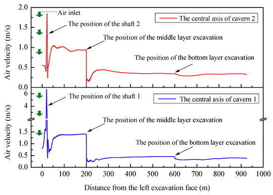 Although the type and power of the axial-flow fans arranged at the shaft inlet are the same, the difference in diameter between shaft 1 and shaft 2 will cause different air velocity in the shaft and within a certain range of the cavern. Therefore, the average air velocity on the central lines of cavern 1 and cavern 2 were monitored in the CFD simulations, and the velocity distribution in the cavern is shown in Figure 12. There is a large velocity fluctuation at the intersection of the shaft in the two caverns, and the velocity in the upper excavation area is basically stable after 50 m. The values for cavern 1 and cavern 2 are 1.4 m/s and 1.0 m/s, respectively.