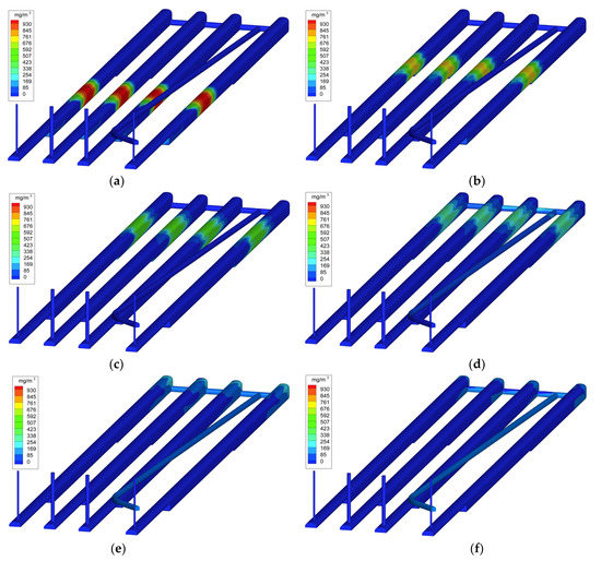 CO concentration distribution with time in caverns under the optimized ventilation scheme: (a) Ventilation for 5 min; (b) Ventilation for 10 min; (c) Ventilation for 15 min; (d) Ventilation for 20 min; (e) Ventilation for 25 min; (f) Ventilation for 30 min.