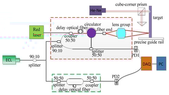 As is shown in Figure 1, the ECL has been used for five years and is connected with two interferometers. One is the auxiliary interferometer (as shown in the green box), whose output is used as the sampling signal to correct the tuning nonlinearity. The other is the measurement interferometer (as shown in the red box), whose output contains the information of measured distance. First, 10% power of the ECL goes into the auxiliary interferometer and the output is received by photo-detector 2 (PD2). Meanwhile, the remaining 90% of the power of the ECL goes into the measurement interferometer. Then, making use of a 90:10 optical splitter, 10% is used as the reference signal and 90% is used as the measurement light. Photo-detector 1 (PD1) obtains the output of the measurement interferometer. Finally, PD1 and PD2 convert the optical signals to the electric signals, and send the signals to the data acquisition card (DAQ). The He-Ne interferometer is used to verify the accuracy of our system.