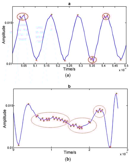 where denotes a set of all of the sampling points, denotes a set of all of the maximum extreme points, and denotes a set of all of the minimum extreme points. Then, we find that the amplitude and the time interval of the erroneous sampling points is obviously smaller than the correct sampling points. Firstly, we set the amplitude thresholds to delete part of the erroneous sampling points, and the rest of the sampling points can be written as: