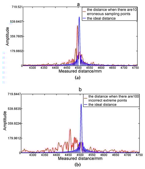 where is the measurement error caused by the erroneous sampling points of the auxiliary interferometer, is the measured distance when there are erroneous sampling points, and is the ideal measured distance when there are no erroneous sampling points. Figure 3a shows the comparison of the simulated result when there are 10 erroneous sampling points (the red line) and the ideal distance (the blue line). In our experiments, is 1.4682, is 1.0003, and is 20.05832 m. When the ideal value of P is 9000, N is 60,000, and is 10, the measured distance error is 758.9 μm, which is agreement with the theoretical measurement error of 760 μm, which is calculated by Equation (11). Obviously, the accuracy of the measurement distance is greatly affected. Besides, the main lobe energy of the spectrum decreases, and the side lobe’s energy increase. Hence, it is essential to eliminate the influence of the erroneous sampling points in order to ensure the accuracy.