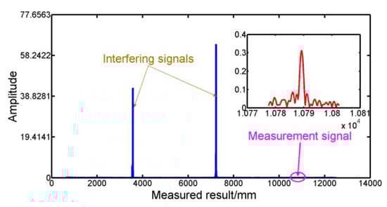 As shown in Figure 4, when our system measures a non-cooperative target, the measurement signal (the red line) becomes very weak, and the interfering signals (the blue line) are much stronger than the measurement signal. In addition, the frequencies of the interfering signals are not varying with the measured distances and are lower than the frequency of the measured signal, so we can use an appropriate low pass filter to delete them. Thus, the SNR of the measurement interferometer output can be shown as /σ2.