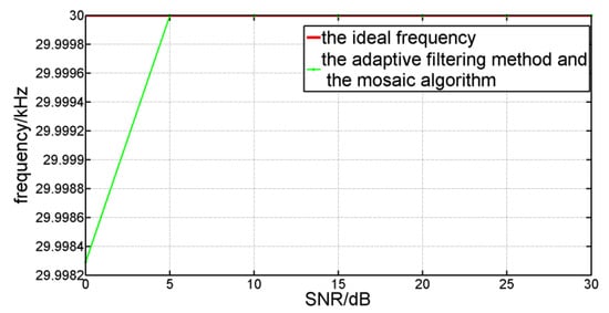 Figure 5 shows the comparison of the ideal frequency (the red line) with the simulated result of our method (the green line). When the SNR of the auxiliary interferometer ranges from 5 dB to 30 dB, the result of our method is the same with the ideal frequency. However, if the SNR is 0 dB, the result of our method is slightly smaller than the ideal frequency. In our experiments, the SNR of the auxiliary interferometer was about 25 dB, and our adaptive filtering method was effective in this situation.