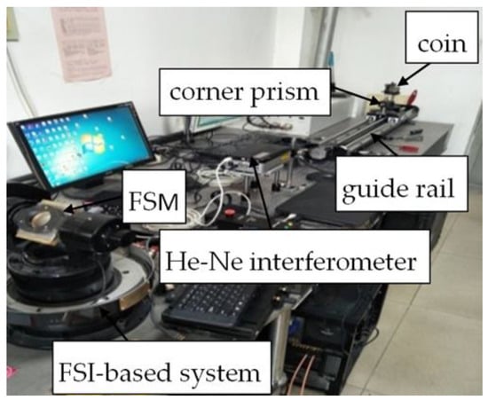 The He-Ne interferometer was used to verify the accuracy of our method. The cube-corner prism of the He-Ne interferometer and the target of the FSI system were both fixed on a slider. The slider moved along a precise guiderail, and the range of the guiderail was 1000 mm.