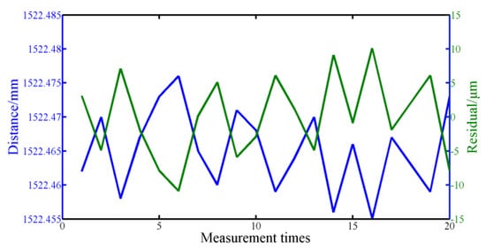 The measured result in Figure 4 consists of two parts. One was the distance from the ECL to the fast steering mirror (FSM) of our FSI-based system, and it can be obtained when the FSM was horizontal. Another was the measured distance from the FSM to the measured target, such as the results in Figure 7 and Figure 8. In our experiments, the former was 8385.432 mm. The measured distance in Figure 7 and Figure 8 was the measured result minus 8.385.432 mm.