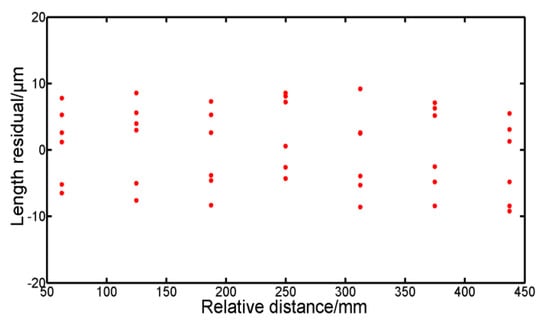 To evaluate the accuracy of our method, the coin moved 62.45 mm every time, and totally moved seven times. The FSI-based system and the He-Ne interferometer simultaneously measured the displacement of the slider. So, our FSI-based system and the laser interferometer could use the same air refractive index. The measured results of the laser interferometer were used as the truth value of the moving distance. Figure 9 showed the difference between the measured results of our systemand the laser interferometer. The max relative error of our method was 9.6 μm. The relative error was attributed to the Abbe error, the air-path distance variation, and the optical dispersion error. In our experiment, the moving distance was less than 500 mm, so the Abbe error between the laser interferometer and our FSI-based systemwas less than 0.5 μm. The air-path distance variation was mainly caused by the variation of the air refractive index. The temperature, pressure and humidity in the experiments were basically stable, so the error caused by the air-path distance variation was within 1 μm. The optical dispersion error was originated from the optical frequency sweep of the ECL, and was compensated by Equation (7). According to Equation (7), the moving distance was 0.06245 m, was −23 ps2/km, and the tuning bandwidth was 10 nm, so the distance offset was 2.3 μm.