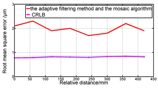The CRLB was used to evaluate the performances of our system. In our experiments, was 1.4682, was 1.0003, was 20.05832 m, the SNR was 5 dB, and the ideal value of N was about 60,000. According to Equation (16), the CRLB was about 0.8 μm. Figure 10 showed the comparison of the measured root mean square error (MSEs) at eight positions with the CRLB. The red and pink data denoted the MSE obtained by the results of six independent measurements and the CRLB of ranging estimation, respectively. The max MSE based on our method at eight different placements was 2.4 μm, which approached the CRLB of 0.8 μm.