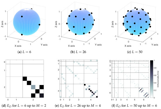 where denotes the identity matrix, C is the re-encoding matrix and transposition is notated by a superscript [18,21]. The layout of loudspeakers and matrix plots of the three Lebedev configurations are presented in Figure 1 for Ambisonic orders up to , which show the regularity for the 6 pt. and near-regularity of the 26 pt. and 50 pt. configurations.