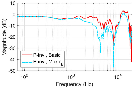 Above , where the sound field is inadequately reconstructed, pseudo-inverse decoding with Max channel weighting was used, which aims to reproduce the energy vector for all directions [18,22,23]. The gains to be applied to k such to maximise are found from differentiation of with respect to ([18], p. 312), such that