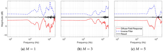 The diffuse-field responses, inverse filters and resulting equalised frequency responses of the 1st, 3rd and 5th-order binaural Ambisonic loudspeaker configurations are presented in Figure 4. The plots show how the diffuse-field responses vary significantly for all 3 orders above , with deviations as large as 9 dB for 1st order.