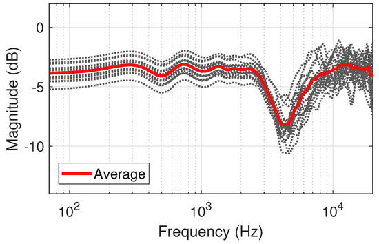To assess whether the need for DFE applies to other HRIR datasets, the diffuse-field response calculations were repeated for 5th-order using the 18 human datasets of individualised HRIRs from the SADIE II (Spatial Audio for Domestic Interactive Entertainment: https://www.york.ac.uk/sadie-project/.) database [37]. The calculated diffuse-field responses are illustrated in Figure 5, which shows the necessity for diffuse-field equalisation for all HRIR datasets.