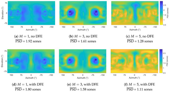 between HRTFs and reference HRTFs with and without DFE (mean of left and right ear PSD calculations): (a) , no DFE, (b) , no DFE, (c) , no DFE, (d) , with DFE, (e) , with DFE and (f) , with DFE. PSD: Perceptual spectral difference; HRTF: Head-related transfer function; DFE: Diffuse-field equalisation.