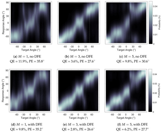 Sagittal Plane Localisation Model [44] plots of binaural Ambisonic rendering, with and without Diffuse-Field Equalisation (DFE): (a) , no DFE, (b) , no DFE, (c) , no DFE, (d) , with DFE, (e) , with DFE and (f) , with DFE. Plots show greater clarity (bolder shading) with DFE implementation.