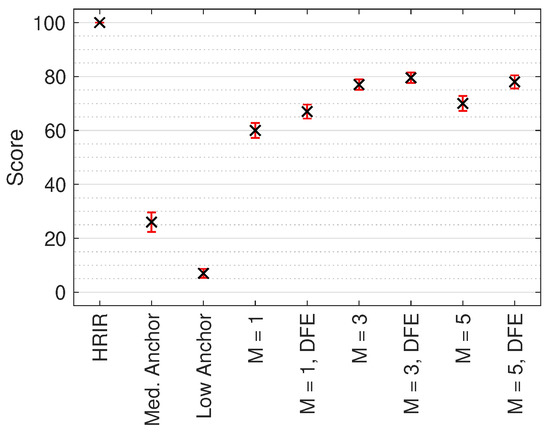 Median MUSHRA results with non-parametric 95% CI across all test sound locations. Score indicates perceived timbral similarity between test stimulus and HRIR reference.