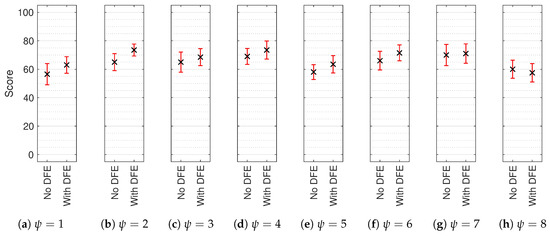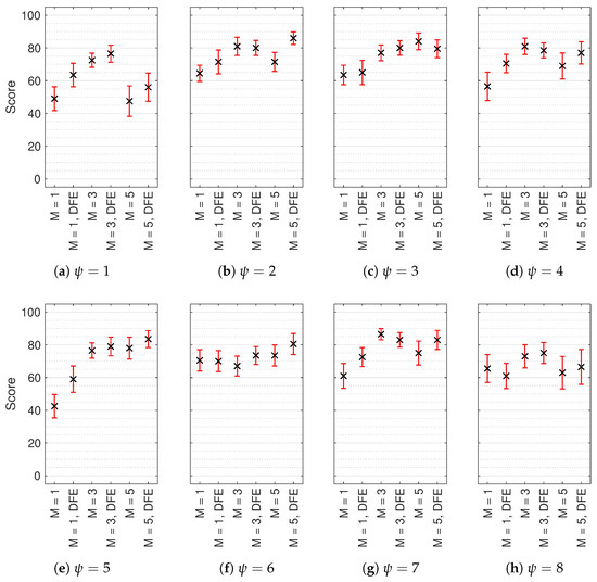 Median multiple stimulus test with hidden reference and anchor (MUSHRA) results with non-parametric 95% confidence intervals (CI) for each test sound location (): (a) , (b) , (c) , (d) , (e) , (f) , (g) and (h) . Reference and anchor scores omitted. Score indicates perceived timbral similarity between test stimulus and HRIR reference.