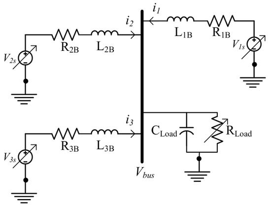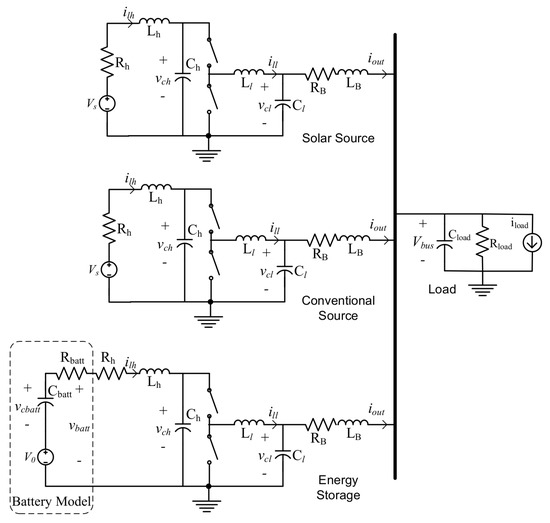 Figure 3. Three sources are included; one is a solar resource, one is a conventional resource such as a diesel generator, and one is an energy storage source such as a battery. In the simulation, these sources are modeled as variable voltage sources, and droop control is implemented for each. The numeric values used for this microgrid model are shown in
