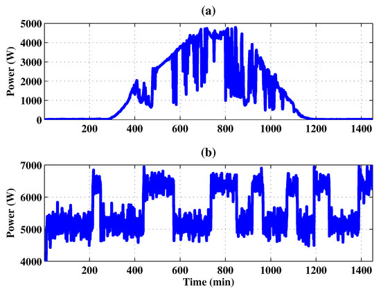 Figure 4a. The data described in the previous section is used, assuming that there are 4 square meters of solar panels available. The required load at each minute is shown in