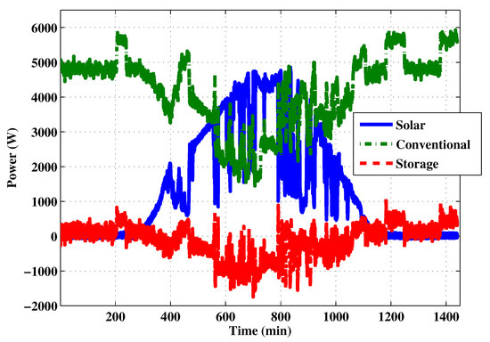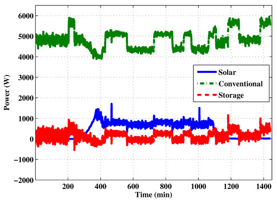 The power supplied by each of the three sources during the simulated one day period is shown in