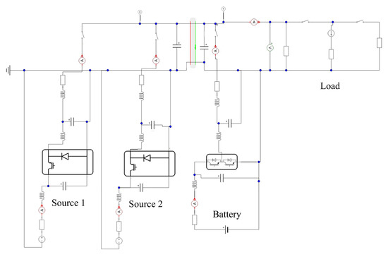 The system was implemented on a Typhoon HIL600 unit using distributed control through Texas Instruments F28335 DSP ContolCARDs. Each of the three sources is controlled using a separate TI card, using only local sensors. The circuit schematic used in the Typhoon software is shown in