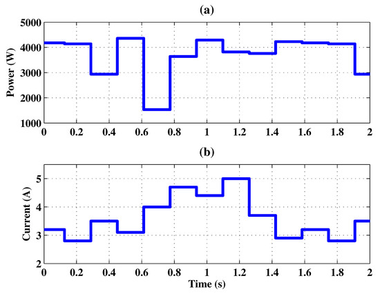 Due to the limitations of the HIL system, a short overall time period was used, and the per-minute solar and load information was scaled. The profiles for power available from the solar resource and required load current are shown in