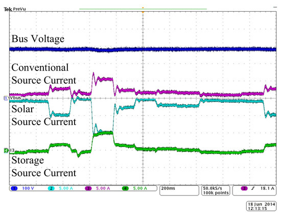 Figure 15. The bus voltage is shown, along with the current supplied from each of the three sources—all three use the same zero point on the oscilloscope trace. As the power available from the sun and the required load change, the conventional and storage sources change their output based on traditional linear droop control. Source 1 changes its output based on optimal high dimension droop control, where the reference current is determined by (