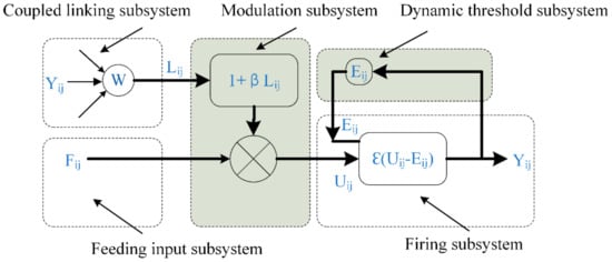 Eckhorn [] proposed the pulse-coupled neural network, which is a third-generation artificial neural network with wide application potential. In 1999, Johnson [] used circuit theory to introduce the PCNN model more specifically, which was subsequently widely applied in various image processing fields. Today, the continuous development of the PCNN model has given it incomparable superiority over the other current image denoising methods. There are two notable features of PCNN in the form of the global coupling and pulsed synchronization of the neurons []. In image processing, a PCNN is a single layer two-dimensional array of laterally linked neurons. Each neuron in the network corresponds strictly to one pixel only in an input image and receives the intensity of that corresponding pixel as an external stimulus. Each neuron also connects with its neighboring neurons and receives local stimuli from them. The PCNN model (Figure 1) is composed of three parts: the dendritic tree of the coupled linking subsystem, the modulation subsystem, and the pulse generator of the dynamic threshold subsystem and the firing subsystem.