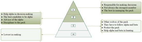 Over recent decades, meta-heuristic optimization techniques, which are inspired by related physical phenomena, animal behavior or evolutionary concepts, have become increasingly popular []. Inspired by the behavior of grey wolves, the Grey Wolf Optimization (GWO) algorithm is a new meta-heuristics method. The tracking processes of grey wolves when encircling and attacking prey are the main steps in the numerical pattern of the GWO algorithm []. The GWO mimics the leadership hierarchy and the hunting mechanism of grey wolves in nature very well. The intelligent grey wolf optimizer was proposed by Mirjalili [] and can perform appropriate trade-offs between the exploration and exploitation abilities of the algorithm. In solving complex benchmark functions, the GWO can be implemented effectively to address complex multivariate optimization problems. In the simulation of the leadership hierarchy, the grey wolves involve four types, designated α, β, δ and ω []. The hierarchy and relationships of the grey wolves and their corresponding duties are described in detail in Figure 2.