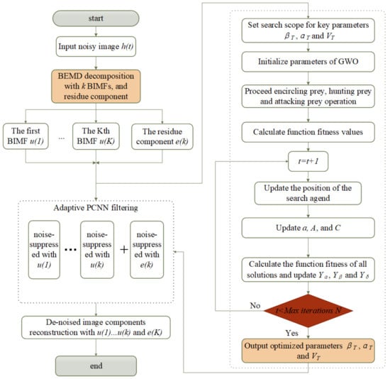 BEMD decomposition: Input raw image df Generate decomposed BIMF and residue . Boundary treatment: Generate edge-symmetric extension, make the original image (m, n) change into (m + 6, n + 6); Initialize the PCNN parameters: Initialize , , and the number of pass N, step length ; GWO algorithm implement: Keep each pixel in an unignited condition; Obtained optimized , and Contaminated points detection and treatment in PCNN: Calculate every neuron values in neighboring region using Equation (7) adjust the threshold using Equation (10); calculate the neuron internal modulation signal using Equation (9); if a neuron (i, j) is ignited in neighbor region and more than 4 adjacent neurons are unignited, the (i, j) pixels brightness will decline an end; if a neuron (i, j) is unignited in neighbor region and more than 4 adjacent neurons are ignited, the (i, j) pixels brightness will increase a end; Otherwise the pixels brightness values of the (i, j) won’t change end; Compare the values and values, record the neuron output, ignited or unignited; , if , return to contaminated points detection and treatment Filtering processing: For further noise reduction, apply median filter to the treated image end; Otherwise, end. Reconstruct each component and , and obtain the final denoising image |