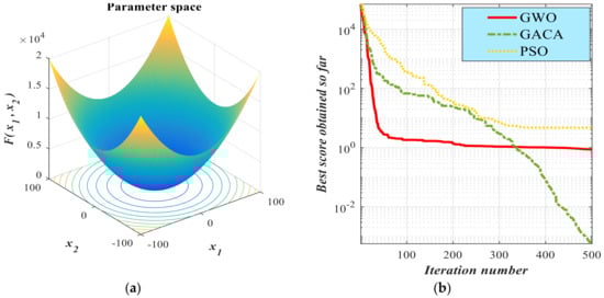(a) The 3D surface plot of the tested function in the parameter space: , ,; (b) the calculated convergence curve through 500 iterations of the grey wolf optimization (GWO), genetic ant colony algorithm (GACA), and particle swarm optimization (PSO) method.