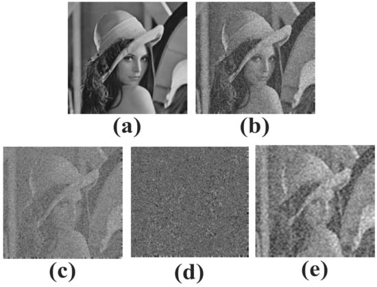 Results of decomposition by bidimensional empirical mode decomposition (BEMD) for the raw Lena image: (a) the original image, (b) the noise polluted image, (c) the decomposed bidimensional intrinsic mode function (BIMF) 1, (d) the decomposed BIMF 2, (e) the residue.