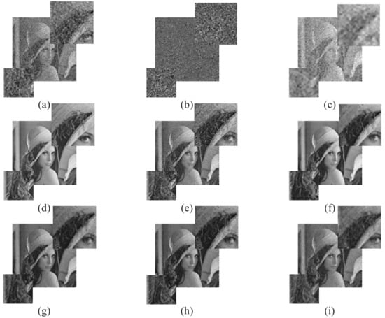 Lena image: (a–c) the noise-suppression BIMF 1 to 2 and the residue, (d) The proposed BEMD-GWO-pulse-coupled neural network (PCNN) reconstruction image, (e) median filter, (f) PSO-PCNN method, (g) GACA-PCNN, (h) conventional random parameters (COR)-PCNN, (i) tBEMD-non-linear complex diffusion process (NLCDP).
