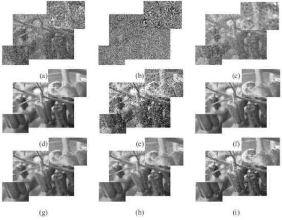 Pepper image: (a–c) the noise-suppression BIMF 1 to 2 and the residue, (d) The proposed BEMD-GWO-PCNN reconstruction image, (e) median filter, (f) PSO-PCNN method, (g) GACA-PCNN, (h) COR-PCNN, (i) tBEMD-NLCDP.