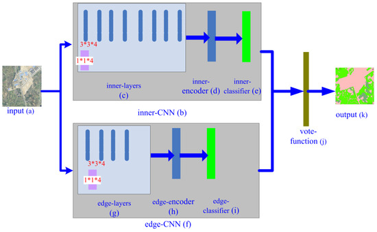 Network architecture of the Hybrid Structure Convolutional Neural Network (HSCNN): (a) input; (b) inner-CNN; (c) inner-layers; (d) inner-encoder; (e) inner-classifier; (f) edge-CNN; (g) edge-layers; (h) edge-encoder; (i) edge-classifier; (j) vote function; (k) output.