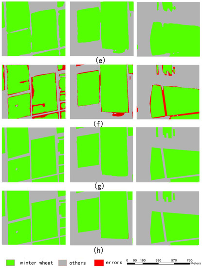 Table 1, Table 2 and Table 3 are confusion matrices c for the segmentation results of SegNet model, DeepLab model, and HSCNN model, respectively. Each row of the confusion matrix represents the proportion taken by the actual category, and each column represents the proportion taken by the predicted category. As can be seen from the tables, our method achieves better classification results. In the example above, the proportion of “winter wheat” wrongly categorized as “background” is on average 0.069, and the proportion of “background” wrongly classified as “winter wheat” is on average 0.019, resulting in an overall accuracy of 91.2%.