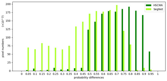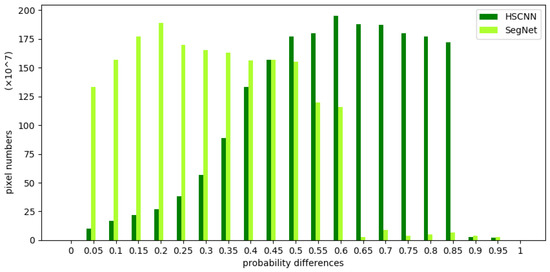 Both HSCNN and SegNet use classifiers to generate the probability distribution of the classes, and consider the class with the maximum probability (max) in the distribution as the type to which the pixel belongs. Clearly, a larger difference between the max and background implies a higher separability of the pixels and more reliable results. The probability differences given by the HSCNN and SegNet model for the inner wheat and edge wheat classes are presented in Figure 4 and Figure 5, respectively. It is clear in Figure 4 that HSCNN and SegNet lead to significant probability differences for many pixels in the interior, which demonstrates the high separability of this region and the strength of CNN. In the probability distribution in Figure 5, fewer pixels are noted as having large probability differences in both the HSCNN and SegNet; nevertheless, the number is maintained at a quite high level for the HSCNN, whereas SegNet exhibits a reduced performance.