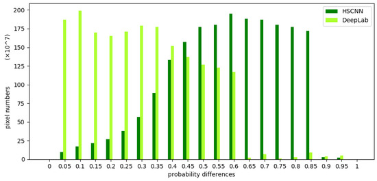 As in Section 4.2, the probability differences between the HSCNN and DeepLab models in the inner wheat and edge wheat class are displayed in Figure 6 and Figure 7, respectively. It is clear in Figure 6 that both the models produce large probability differences for many pixels in the interior. In the probability distribution of Figure 7, a considerable number of pixels still display large probability differences after the HSCNN processing, whereas DeepLab shows a much poorer performance (even lower than SegNet), proving again the notion that the atrous convolution is not suitable for farmlands.