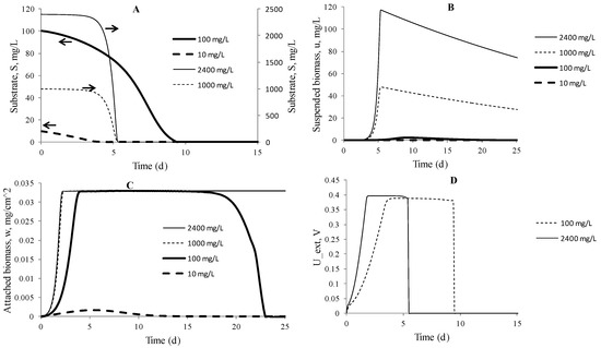 The simulation results are shown in Figure 3. Initial substrate concentrations of 1000 and 2400 mg L−1 did not show obvious decrease in the first 4 d (Figure 3A), but substrate was consumed dramatically after this period. MFCs started with the lower substrate concentrations behaved differently from the higher strength cases, as a continuous and gradual decrease was observed. The substrate in the case of 100 mg L−1 lasted the longest, i.e., 9 d, which almost doubled that in the higher strength cases. These results indicated that it was not always that more concentrated substrate could sustain the longest reaction period, and a moderate substrate concentration should be chosen for keeping MFC from starvation. Trends of substrate utilization were generally the work of suspended bacteria, which could accumulate to a high level and subsequently, consumed substrate at a high rate that rapidly reduced substrate concentration (Figure 3B). For example, in the initial substrate concentrations of 100 and 2400 mg L−1, the peak suspended biomass concentrations were 2.5 and 117 mg L−1, respectively. The latter was 47 times higher than the former, which consumed substrate at a higher rate due to two reasons: the higher level of biomass concentration and the enhanced specific substrate utilization rate indicated by the Monod equation (Equations (15) and (16)).