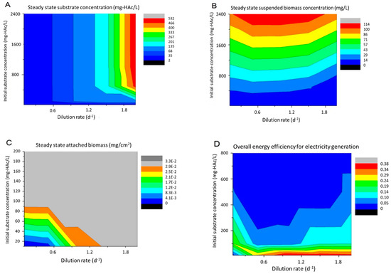 At a given level of the influent substrate concentration, the steady state substrate concentration went up with the increasing dilution rate, basically due to the increased substrate inflow to the reactor (Figure 6A). When the influent substrate concentration was higher than 500 mg L−1, the concentration did not have much impact on the steady state substrate concentration at a given dilution rate. But when the influent concentration was lower than 500 mg L−1 and the dilution rate was greater than 1.5 d−1, the steady state concentration increased along with the influent concentration. The suspended biomass concentration obviously increased with the influent substrate concentration in a linear manner at any dilution rate (Figure 6B). The dilution rate between 0.5 and 1 d−1 resulted in a maximum suspended biomass at a given influent substrate concentration, because a lower rate caused substrate limitation and a higher rate could partially wash out suspended biomass. The attached biomass was more stable and could generally achieve its maximum in most cases (Figure 6C), except for the cases of Sin, which were much lower than 100 mg L−1 and were too low to provide enough carbon sources for supporting the bacterial growth and attachment. As to the overall energy efficiency, it could be concluded that a higher influent substrate concentration reduced the efficiency (Figure 6D). The only exception was the case with about 10 mg L−1 of influent substrate and 0.1 d−1 of dilution rate, under which condition the attached biofilm was not fully mature, due to substrate deficiency, so the MFC did not generate electricity. Considering the tradeoff between higher electrical power generation (reflected by the attached biomass concentration, which was the catalyst) and acceptable overall energy efficiency, it was recommended to operate MFC with about 100 mg L−1 of influent substrate concentration. Meanwhile, at this substrate concentration, the choice of a lower dilution rate, e.g., 0.1 d−1, would help achieve lower effluent substrate and better removal efficiency, and the choice of a larger dilution rate, e.g., 2 d−1, might otherwise help generate more electric energy.