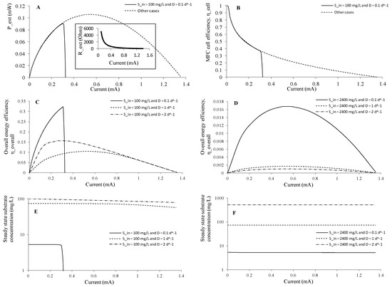 Simulated MFC performance at steady state under different electrical currents (or external resistors), dilution rates and influent substrate concentrations. (A) steady state power density; (B) MFC cell energy efficiency; (C) overall energy efficiency at Sin = 100 mg L−1; and (D) Sin = 2400 mg L−1; (E) effluent substrate concentration at Sin = 100 mg L−1; and (F) Sin = 2400 mg L−1.