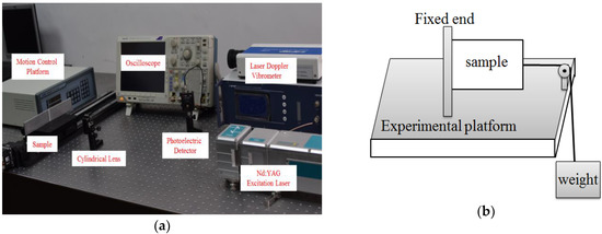 Experimental system: (a) ultrasonic laser and (b) pre-stress loading apparatus.