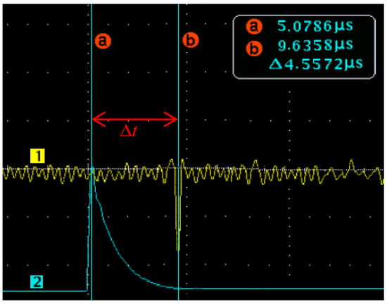Travel time of surface waves in the base material without stress. The change in distance is , Channel 1 is the vibration signal, Channel 2 is the time reference signal, a and b are the cursors for reading travel time.