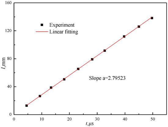 Linear fitting curve of the experimental results, the slope represents the velocity of surface wave propagation in the TC4 base material.