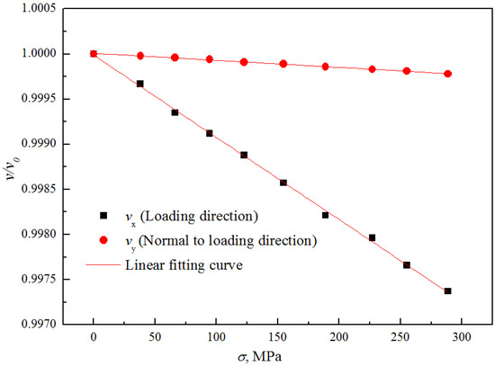 This stage of calibration involves applying different loads on a sample and measuring the corresponding acoustic wave velocities. The experimental results confirmed the linear evolution of the relative variation of the velocity as a function of the load, and the slope directly corresponds to the acoustoelastic coefficients. From Equations (3) and (4), for a definite pre-stress, if the surface wave propagation velocity along the and directions is measured, we obtain the acoustoelastic coefficients , respectively.