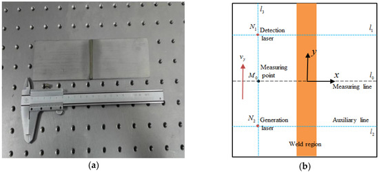 (a) Experimental specimen and (b) layout of measuring line when measuring the velocity , where is a measurement point; is the measuring line; , , and are the auxiliary lines; and and are the positions of the laser beam.