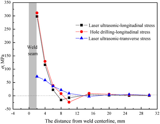 Figure 6 shows the residual stress distribution of weld 1 with a welding power of 2800 W, welding speed of 6.0 m/min, and heat input of 28 kJ/m. Since the boundary conditions at both ends of the weld centerline were similar, a symmetric approach was assumed in the residual stress profile. It was reasonable to assume that data points at the same distance but at either sides of the centerline would have the same value of residual stress. These types of symmetric approaches were adopted in a number of research studies on welds [3,4]. The longitudinal residual stress was greater than the transverse residual stress. The longitudinal residual stress was high tensile stress near the welding seam, and the maximum values of longitudinal and transverse residual stresses were 297.7 MPa and 72.4 MPa near the HAZ, respectively. The longitudinal stress decreased rapidly with increasing distance from the weld centerline, passing through zero at a distance near to the weld centerline and leading to the balancing of the compressive stress at approximately −15.7 MPa in the far field. The welding residual stress reached one-third of the yield strength of the material. If residual stress is superimposed with external forces, it easily exceeds the yield strength, resulting in plastic deformation and failure of the components. The longitudinal residual stresses measured by the hole-drilling method and ultrasonic laser method were basically the same. However, error and uncertainty in measurement are inevitable. For the hole-drilling technique, the stress uncertainty mainly depends on the absolute value of the strain. For the ultrasonic laser technique, the uncertainty mainly depends on the propagation velocity of the ultrasonic waves. Considering the maximum longitudinal residual stress, corresponding to the ultrasonic laser and hole-drilling techniques, the uncertainty of measurements were 1.2 MPa and 2.4 MPa, respectively.