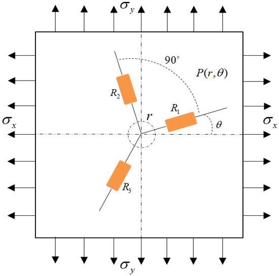 Diagram of sensitive grid arrangement is the angle between the principal stress and the strain gauge , and the angle between the strain gauge and is .
